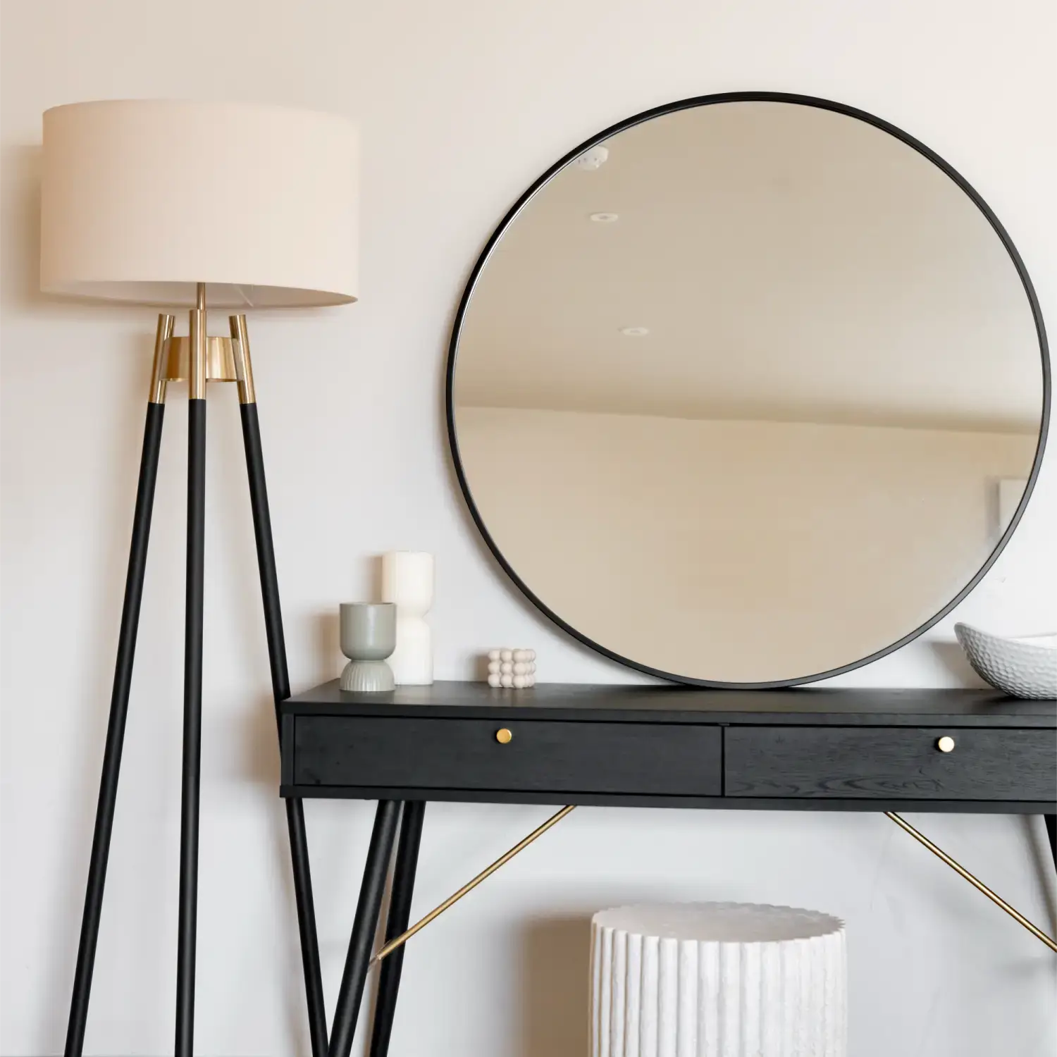 Introducing the Rei – a modern mirror that combines sleek design with robust construction. This extra-large, round mirror, available in a generous 90cm x 90cm size, features a refined design that serves as the ideal finishing touch for any room. Its durable construction includes high-quality metal reminiscent of a round black metal frame, ensuring that the mirror is not only aesthetically pleasing but also a smart investment for long-term home decor.
