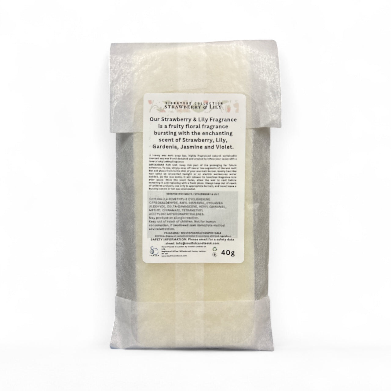 Bright, fruity and floral. Hand-poured in Hackney with 100% soy wax, this 40g snap bar blends juicy strawberry with elegant lily, gardenia, jasmine and violet for a cheerful, uplifting fragrance. Vegan, eco-friendly and perfect for a fresh home feel.